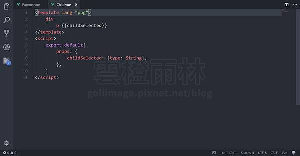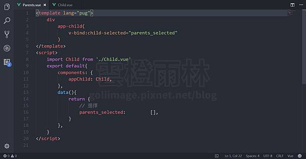 利用上方簡易的寫法,我們在父組件中,利用bind 的方式,將 parents_selected 的陣列,導入到 app-child 子組件中